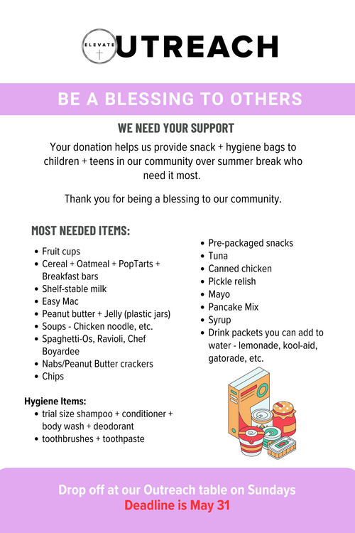 Your donation helps provide toiletry bags filled with essential hygiene items and snack bags with easy, nourishing food for our local homeless shelter. Every donation offers comfort, dignity, and care. Thank you for loving our community and for being the hands and feet of Jesus to those in need. Join Elevate Church in blessing our local homeless shelter!